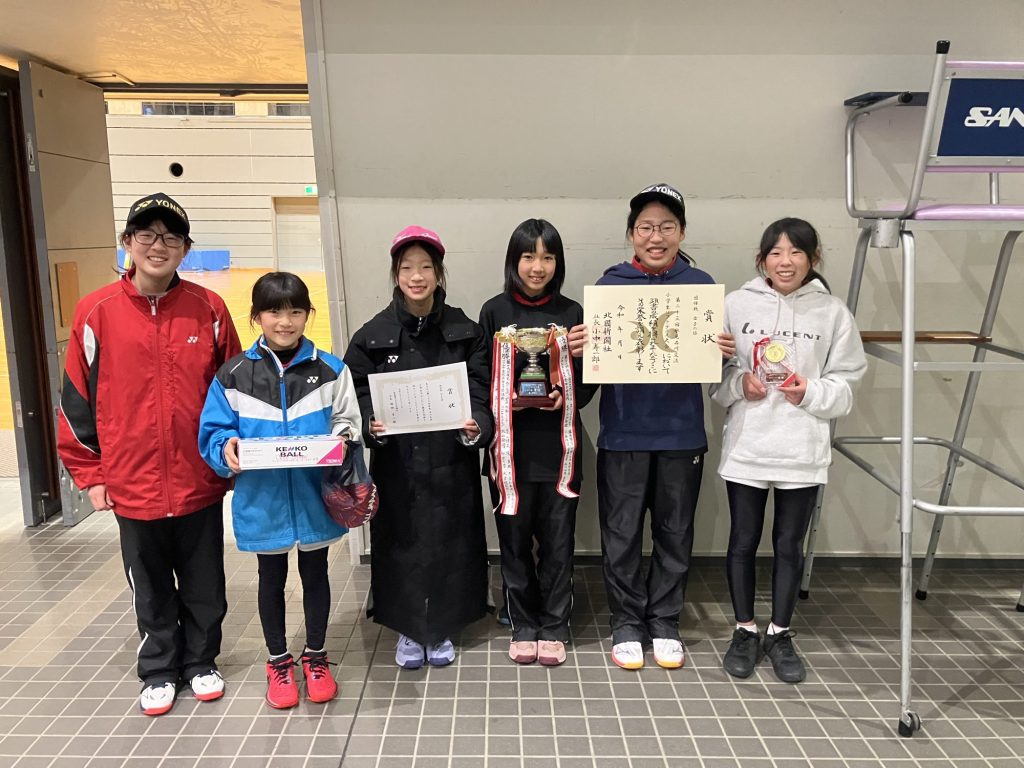 2026年2月21日 / 最終更新日 : 2026年2月21日 matsuyamax51 福井市JSTC 【大会結果】 本日、第23回氷見石川交流小学生ソフトテニス大会の団体戦に出場しました。 男子 ベスト8 女子 優勝(松山美絃、岡本悠杏、成實結愛、大西梨央奈、岡本桃佳、岡本怜樹) ※ベスト4で時間切れとなり、ジャンケンにて優勝を勝ち取りました!